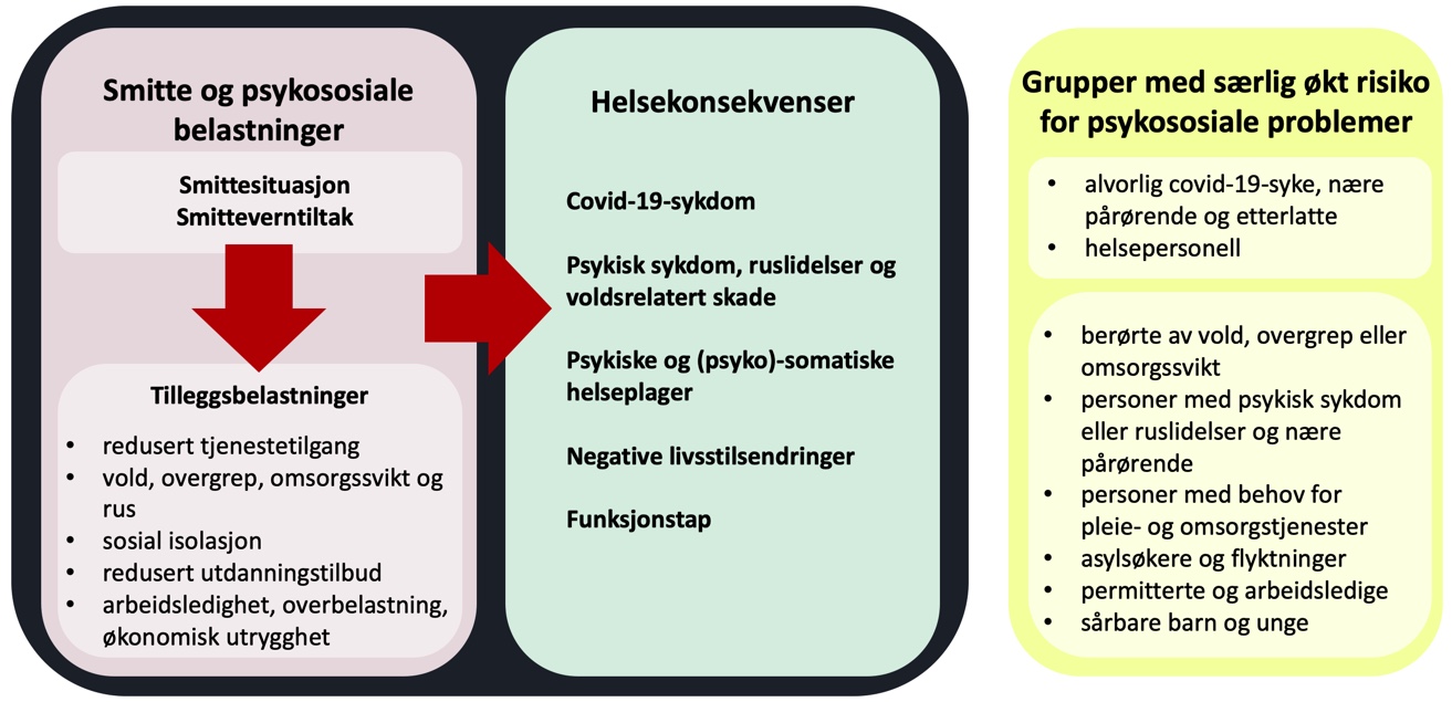 Figur 1. Modell for sammenhenger mellom smittesituasjon, psykososiale belastninger og helsekonsekvenser under covid-19 pandemien.